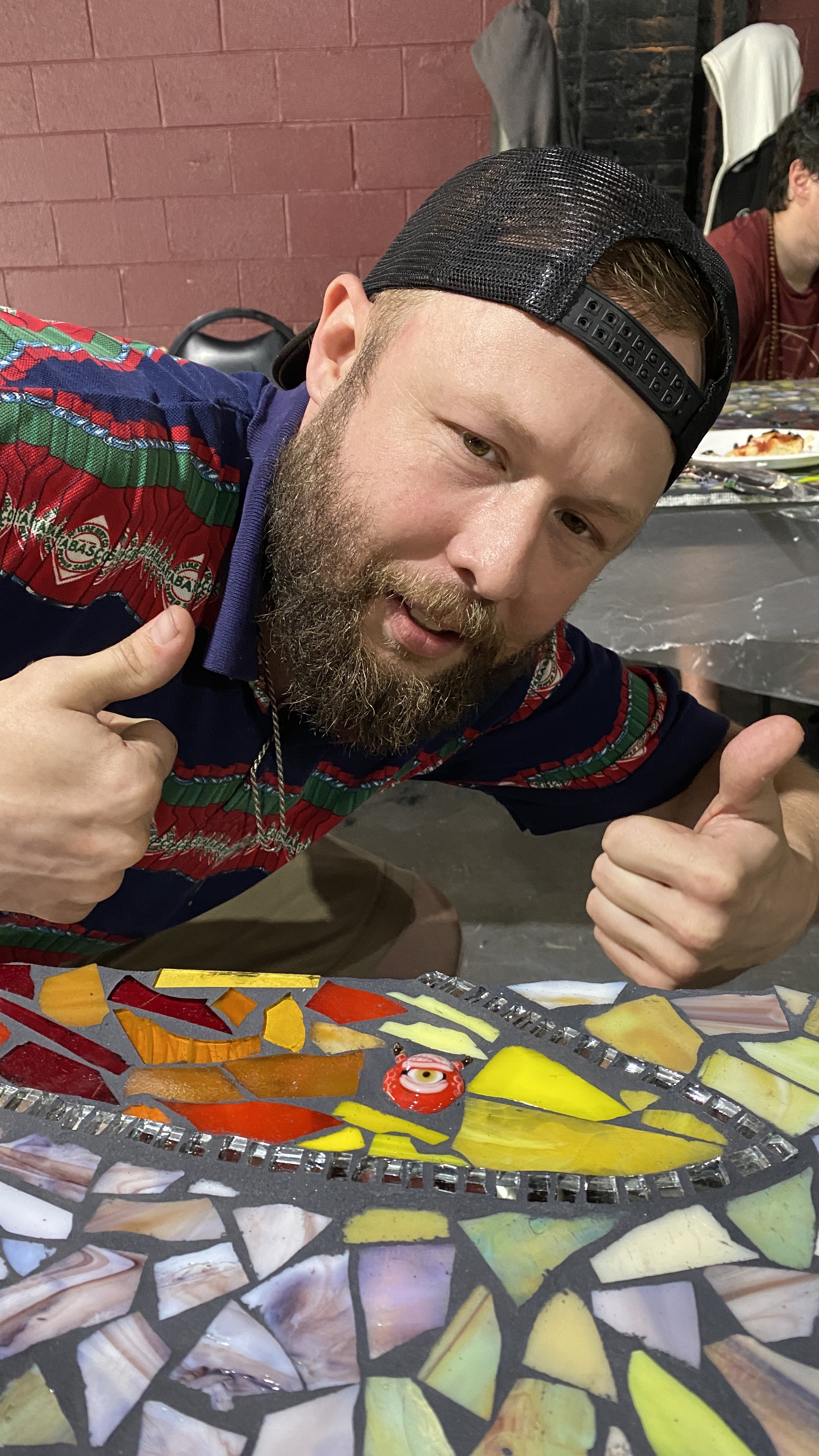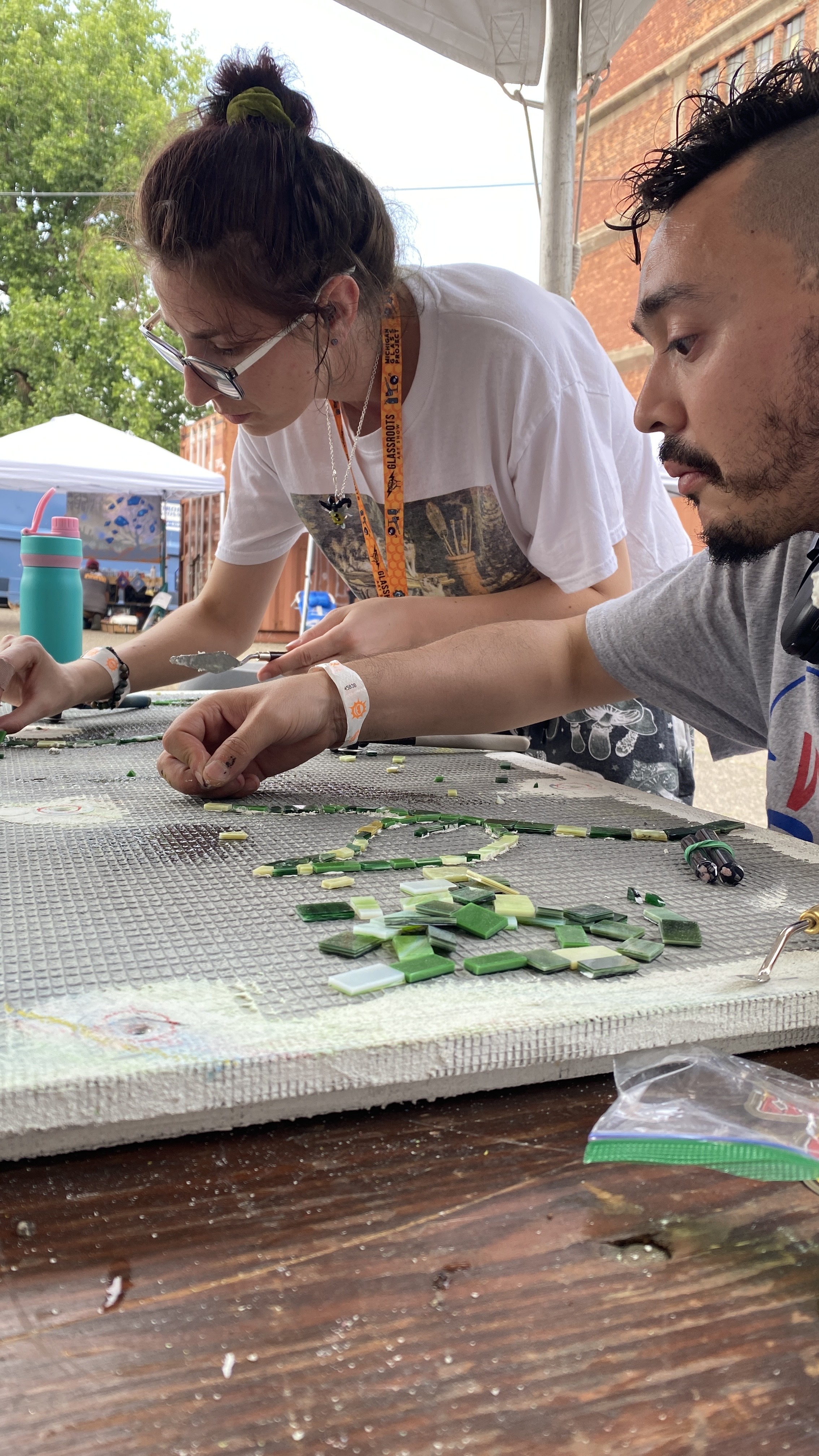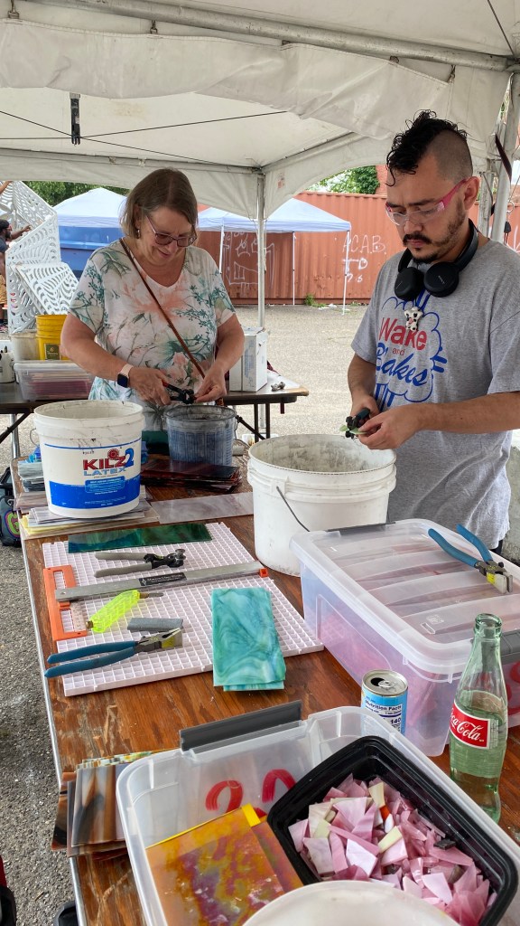 Breaking down more glass during the festival, June 21 eveningCementing glass in place to fill in the design, June 23, evening