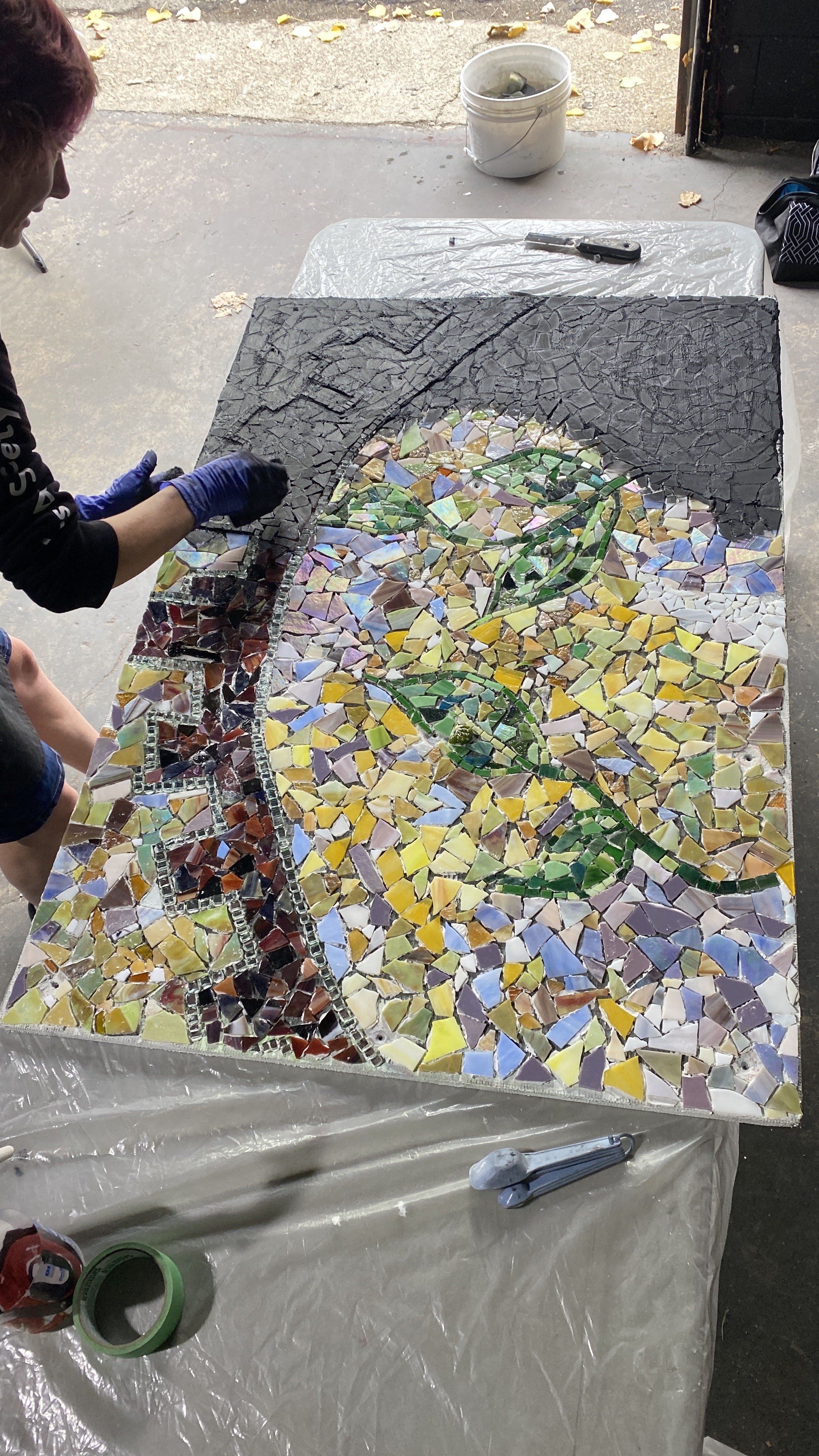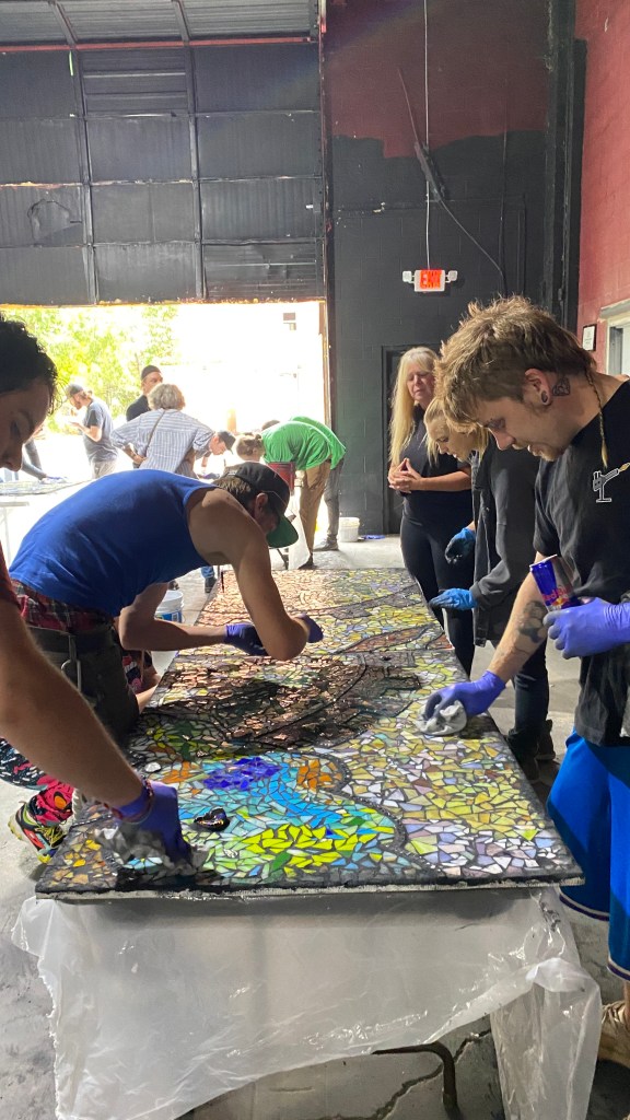 Team of about 15 volunteers helped to grout and polish the mosaic, September 23, 11am – 5pm