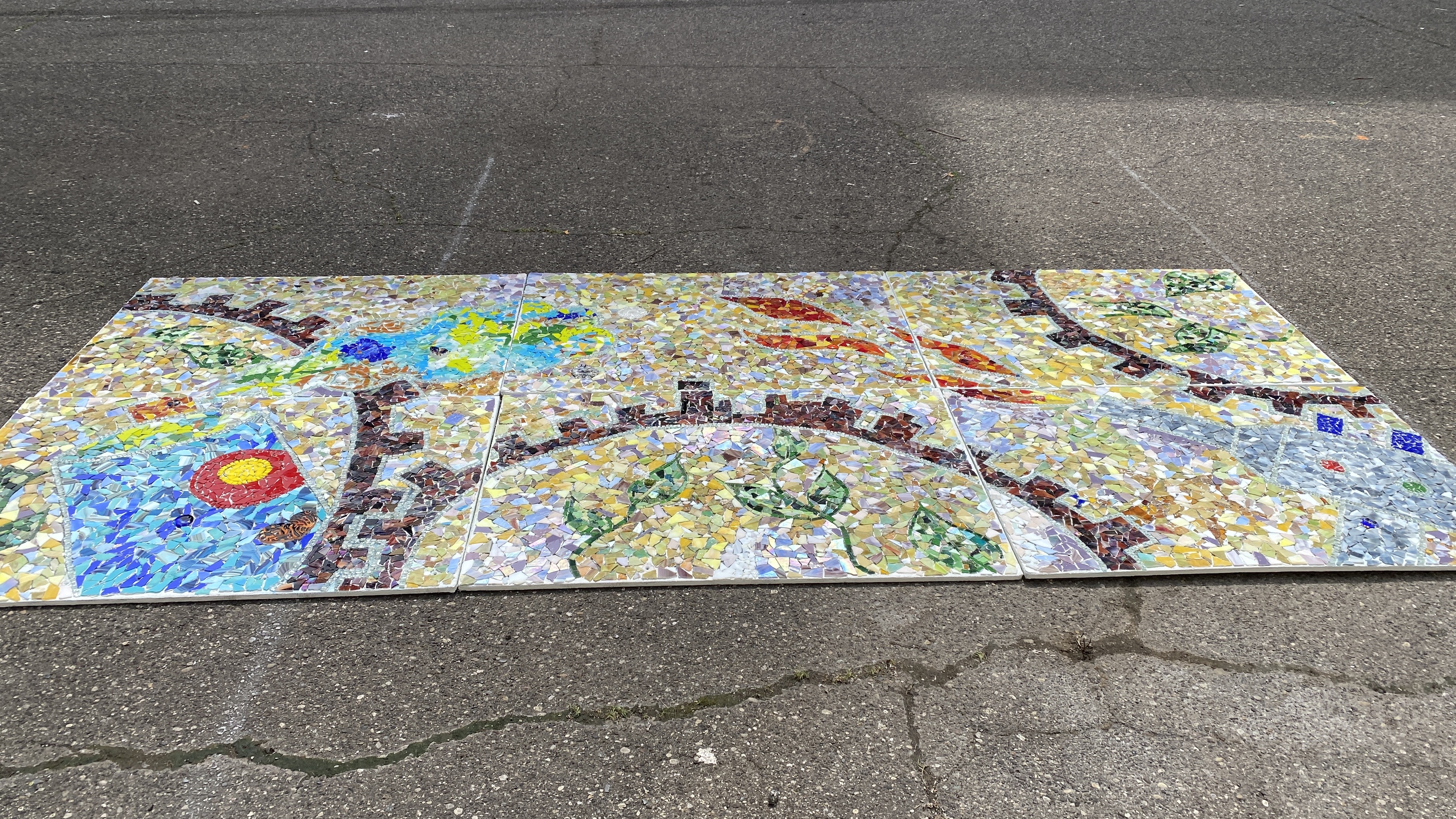 After the mosaic was installed, there were some touchups in paint and additional tiles placed over the seams for design lines to stand out.